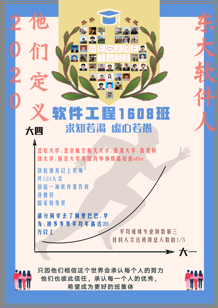 软件工程1608班在成立之初是“贫穷”的,有的只是彼此陌生的新同学、平均成绩专业倒数第三、挂科人次达班级总人数的1/5。但是相信“学习与创造永远不晚”的他们不被未知和迷茫阻挡,不为消沉低落拖累。他们相信这个世界会见证每个人的努力,他们彼此信任,看见每一个人的优秀,希望共同创建的班集体。