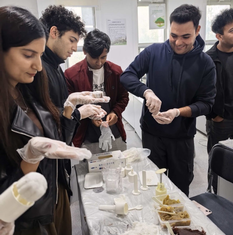 活动伊始,主办方为留学生们讲解了中秋节的起源、习俗与文化内涵,围绕赏月、吃月饼、团圆等传统展开介绍,帮助他们深入理解这一重要节日的情感意义。随后,在专业面点师的指导下,留学生们兴致勃勃地投入月饼制作。从揉面、包馅到压模成型,大家认真学习、相互协作,尽管手法略显生疏,但每一步都充满热情。活动现场欢声笑语,洋溢着浓厚的节日氛围。